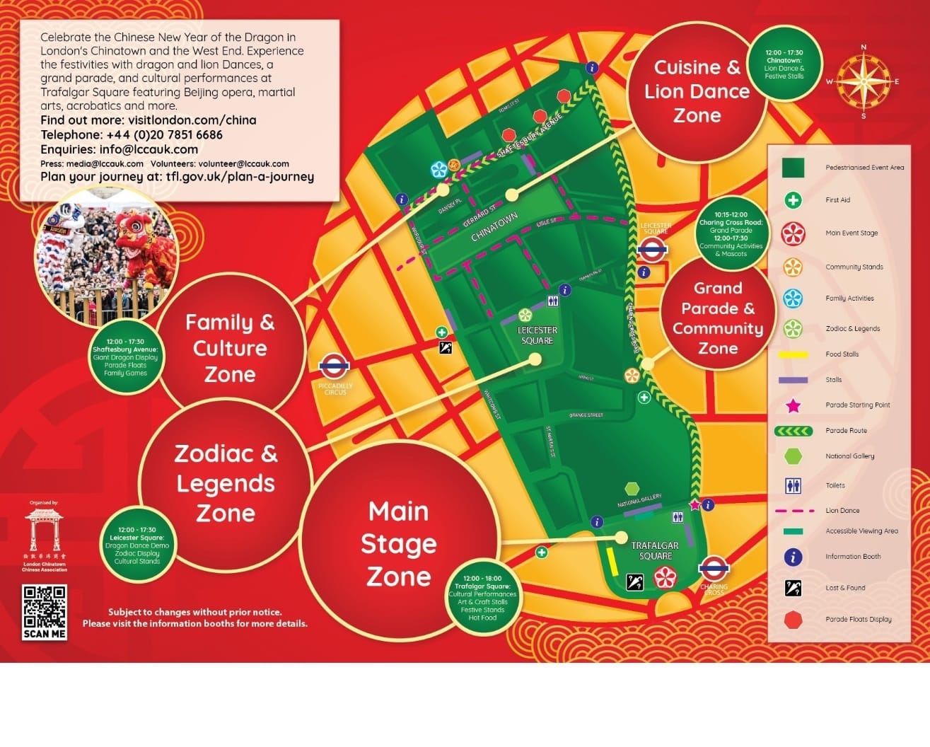 Londonban a kínai újév ünneplése a kínai negyedben indul vasárnap délelőtt 10 órakor és a menet a Trafalgar térre nagyjából 11 óra környékén ér. A felvonulás útvonala a következő lesz: Duncannon Streeten (Trafalgar tér mellett) - Charing Cross Road - Shaftesbury Avenue - Rupert Street.