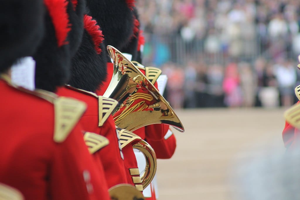 A zenét a nagyjából 400 fős, mindenféle regimentekből származó zenészek adják, majd mikor az uralkodó visszatér a Buckingham Palotába - ahol újabb felvonuló egységek várják - a közeli Green Parkban ágyúkból leadják a 41 üdvözlő lövést, majd a királyi család a palota erkélyén megtekinti az épület fölött elrepülő királyi légierő bemutatóját. Jó tudni, hogy a repülők 2024-ben délután 12.45 és 1.10 között repülnek át a Buckingham Palota fölött.