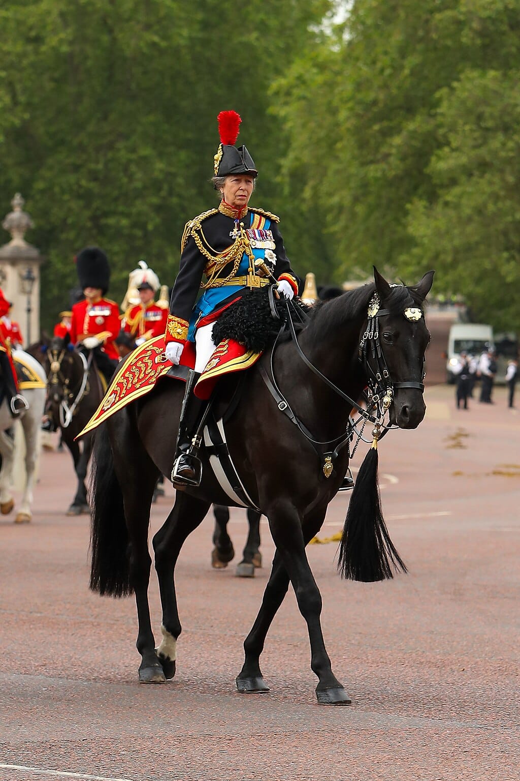 A fenti képen a 2023-ban 72 éves Anna királyi hercegnőt láthatjátok testvére, III. Károly király parádéján, lóháton. Egyenruhája a Blues and Royals ezredesi egyenruhája, a parádén pedig mint Gold Stick-in-Waiting , azaz formális testőri szerepben vett részt, az uralkodó személyes kísérőjeként. Maga a formális testőri kíséret még a Tudor időkből maradt a mai brit királyi házra.