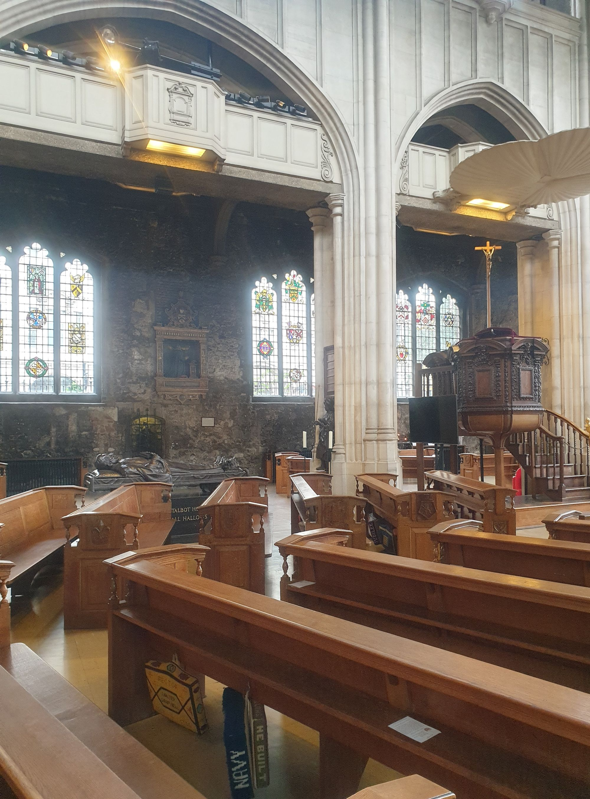 Szerencsére az All Hallows templomot nagyrészt elkerülték a pusztító lángok, de így is keletkezett némi kár az épületben, ennek nyomát a belső falakon, az oltárral szembe állva a bal oldalon láthatjuk.