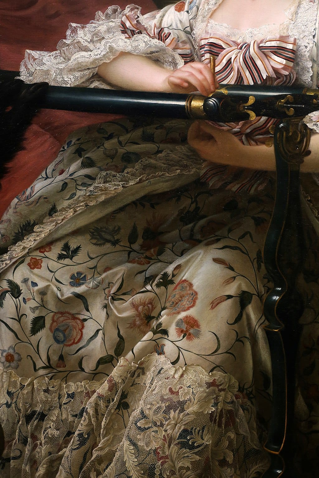 Folytassuk a sort François-Hubert Drouais csodálatos festményével, melynek címe Madame de Pompadour a tamburinjával (1763) és a galériában a 33-as teremben található.