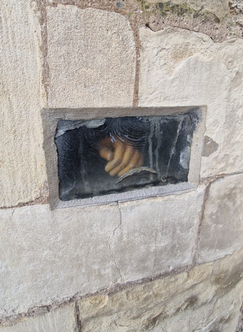 Maga a kéz egyébként nincs egyáltalán eldugva, sőt mi több minden egyes látogató elhalad mellette, ugyanis pontosan a bejáratnál, a North Byward torony falában van, kicsit a szemmagasság alatt, egy homályos plexi lap mögött.