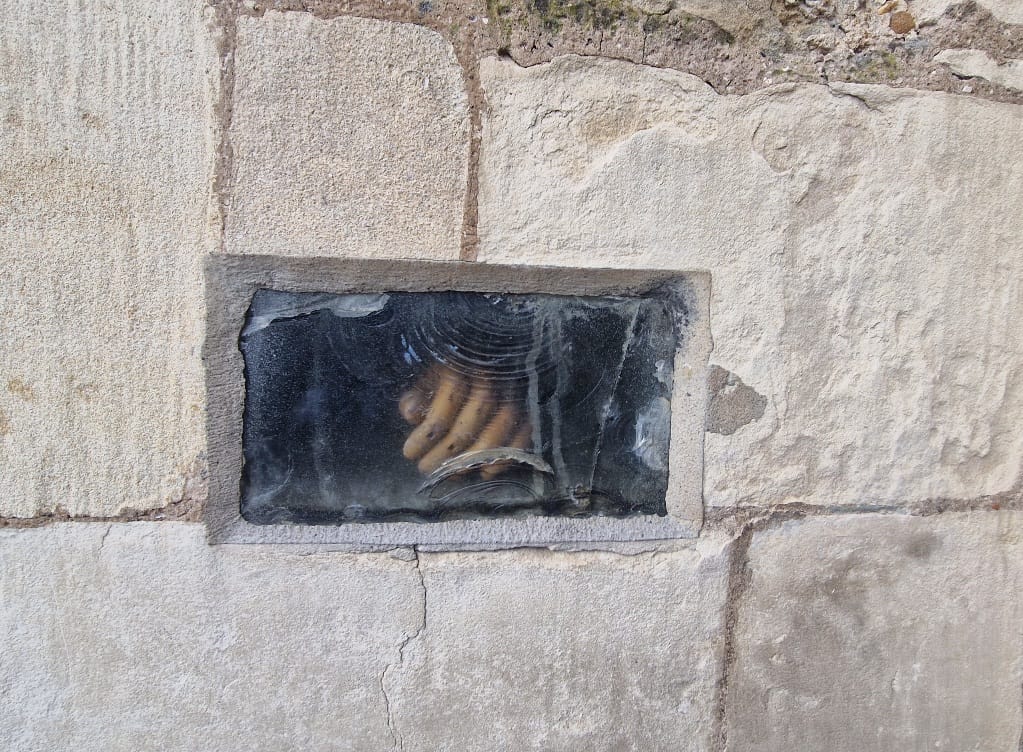 Na de akkor vissza a falban lévő csontvázszerű kézhez, melynek elhelyezkedését a torony oldalában a fenti képen egy piros nyíllal jelöltem, egy üvegezett téglablokk mögött, nagyjából kézmagasságban.