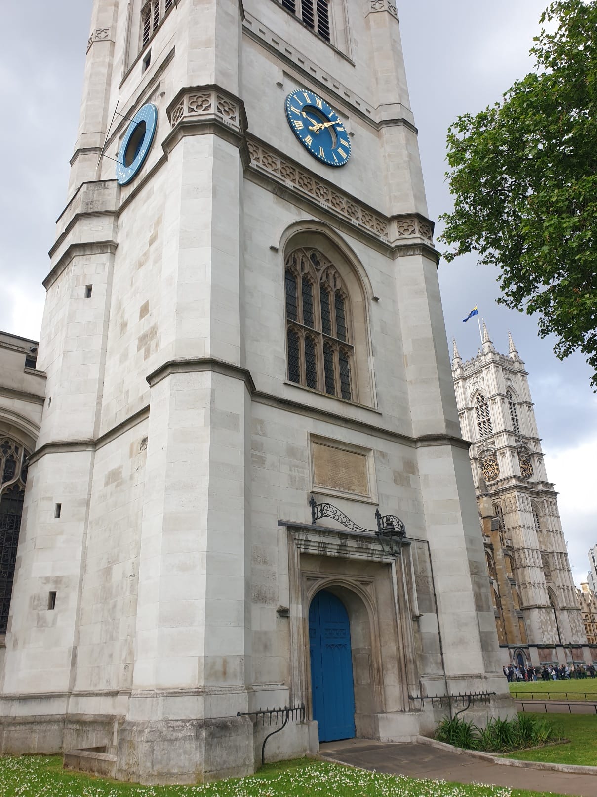 A bejárat fölötti ablak, mely 1888-ban készült, Sir Walter Raleigh-re (1552-1618) emlékeztet, aki I. Erzsébet királynő uralkodása alatt (1558-1603) vezetett expedíciókat a világ felfedezésére és ő volt az akinek közreműködésével megalapították amerikában Virginia államot is. Érdekesség, hogy végül felségárulás okán Sir Raleigh a szomszédos Old Palace Yard-on végezték ki, ugyanis I. Erzsébet királynő halála után a trónra kerülő Jakab király ellen szervezett titkos akciókat azért, hogy inkább unokatestvérét, Arabella Stuartot jutassák a korona közelébe.