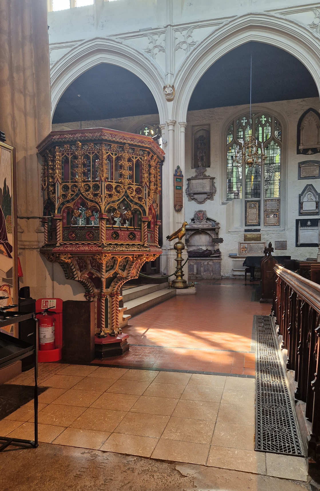 A szentély előtti lépcsők mellett áll egy aranyozott sas kitárt szárnyakkal - Szent János apostol szimbóluma - mely Thomas és Mary Vacher filantrópok emlékére állíttatott 1878-ban. Ugyanígy, a szószék is a Vacher család ajándéka.