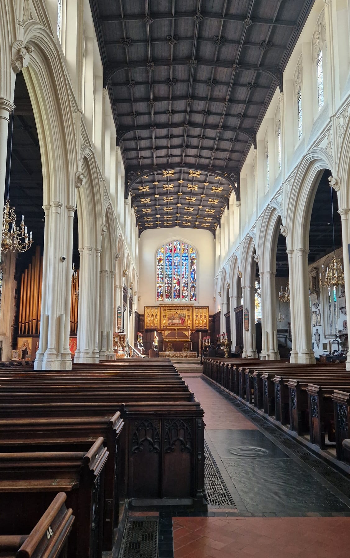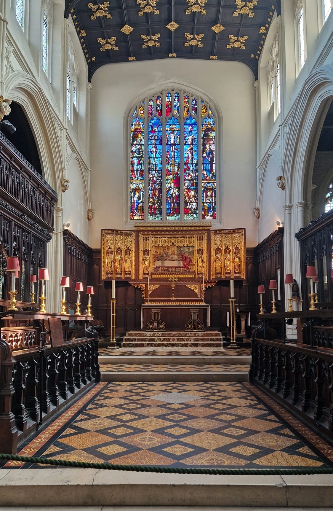 Az oltár fölötti ablak VIII. Henrik és első felesége Aragóniai Katalin kapcsolatának állt emléket, az üveg ide 1758-ban került, de eredetileg valószínűleg Hollandiában készülhetett 1526 környékén.