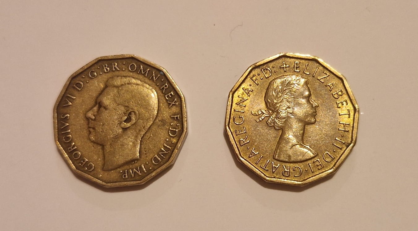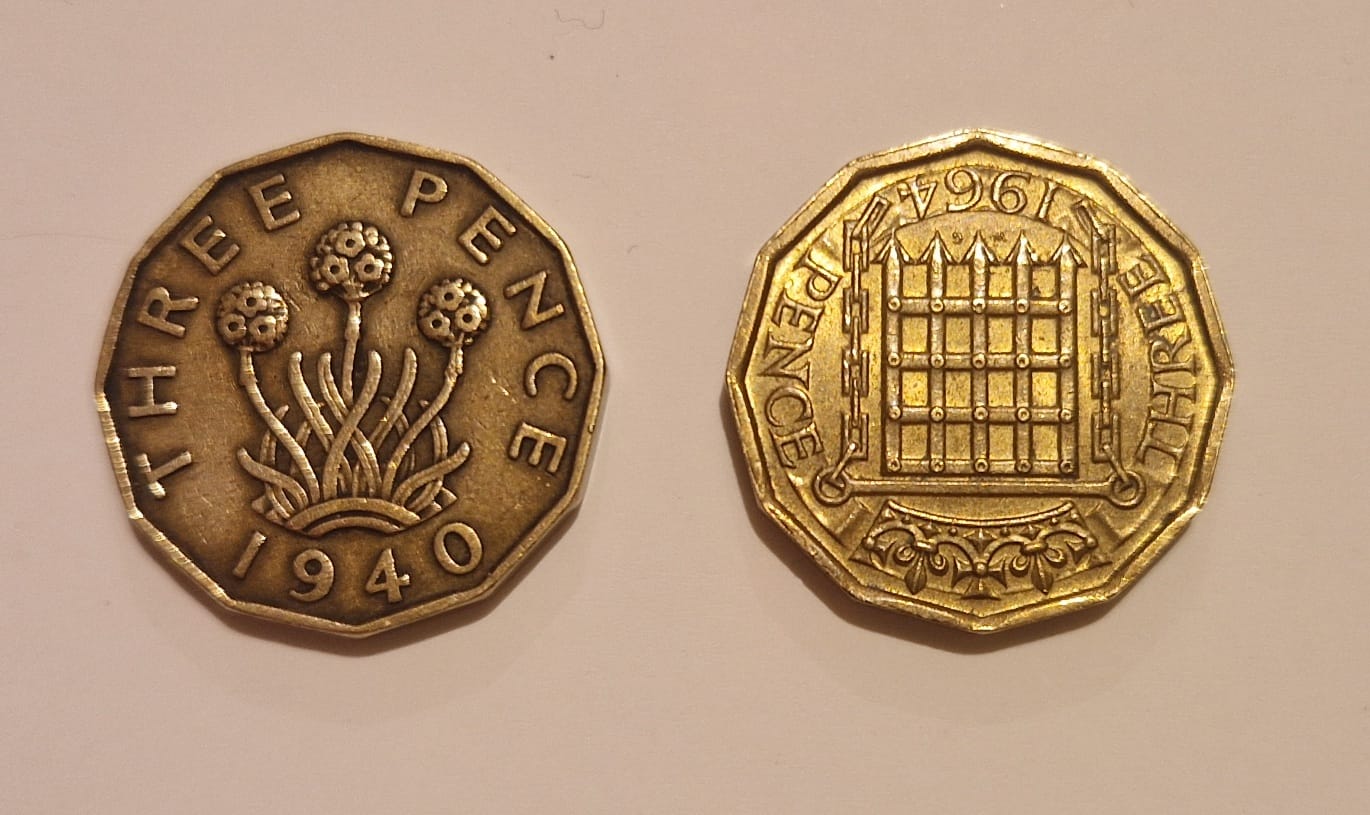 A bejegyzés vége felé pedig ide hoznék két személyes történetet is. Az első az, hogy az egyik londoni bolhapiacon, egy alkalommal vásároltam a ma már forgalomban nem lévő 3 penny-s azaz threepence érmék közül kettőt. Ha a képeket jól megnézitek, akkor az egyiket 1940-ben verték, VI. György király (uralkodott: 1936-1952) idején, a másikat pedig lánya, II. Erzsébet királynő (uralkodott: 1962-2022) idején.
