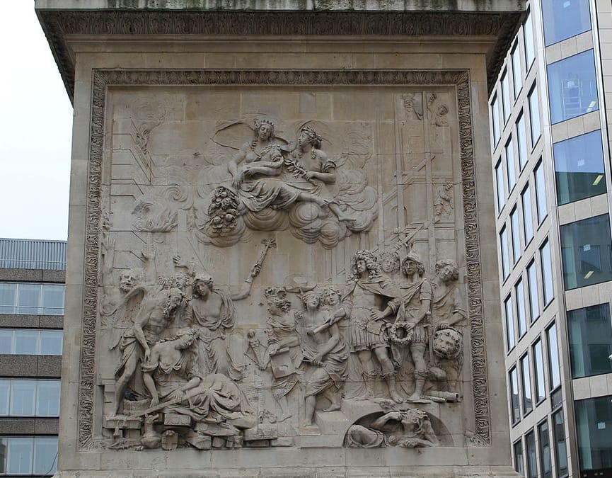 A legérdekesebb domborművet a Monument nyugati oldalán, a Fish Street Hill felé találjuk, az itt megjelenő alakok allegórikusak, London pusztulását majd újjáépítését mesélik el.