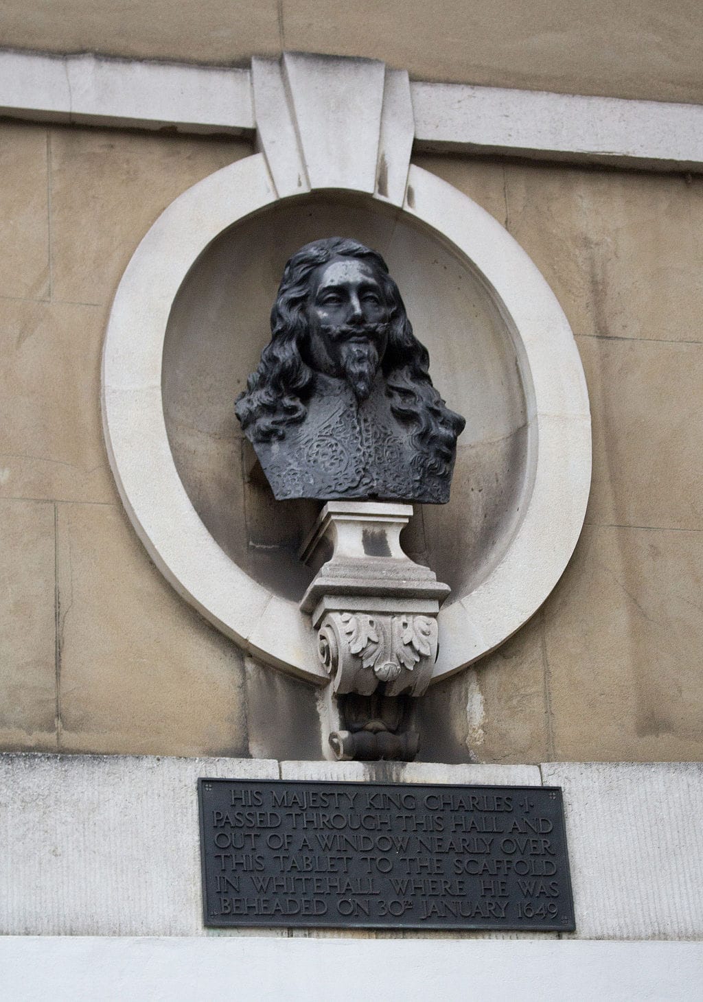 Ekkoriban még állt a Palace of Whitehall és azon belül is az egyik kőből épített épület, a Banqueting House, mely felújítás okán éppen fel volt állványozva, így a király az első emeleti ablakon kilépve járult a bakó elé, aki népes nézőközönség előtt fejét is vette a királynak. Ma az épület bejárata fölött egy fekete mellszobor emlékeztet a szörnyű eseményre, valamint a szemben lévő lovasőrség épületének óráján a feketére színezett kettes szám, ami kijelöli a halál pontos időpontját.