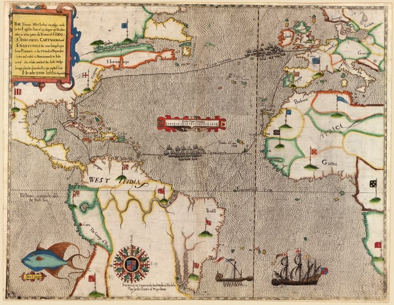 Azonban hamarosan, egészen pontosan 1585-ben Drake már újra hajózott, igaz ezúttal Közép-Amerika, a Karib-szigetek és Florida irányába, ahol módszeresen megtámadta és kifosztotta a partmenti spanyol telepeseket. Hazafelé tartva összeszedte a dél-nyugat-amerikai Roanoke-sziget sikertelen angol telepeseit és készségesen hazaszállította őket Angliába.