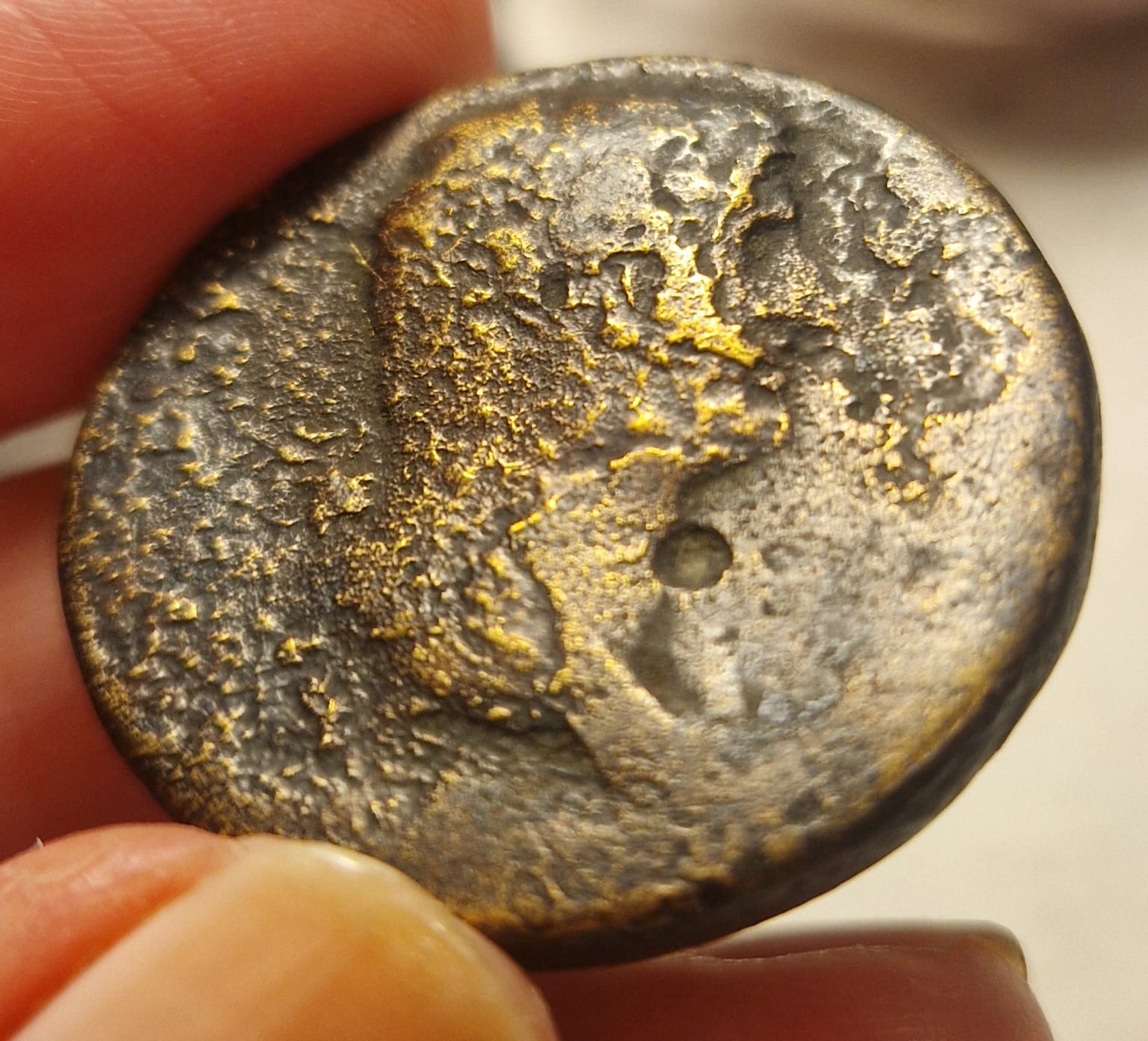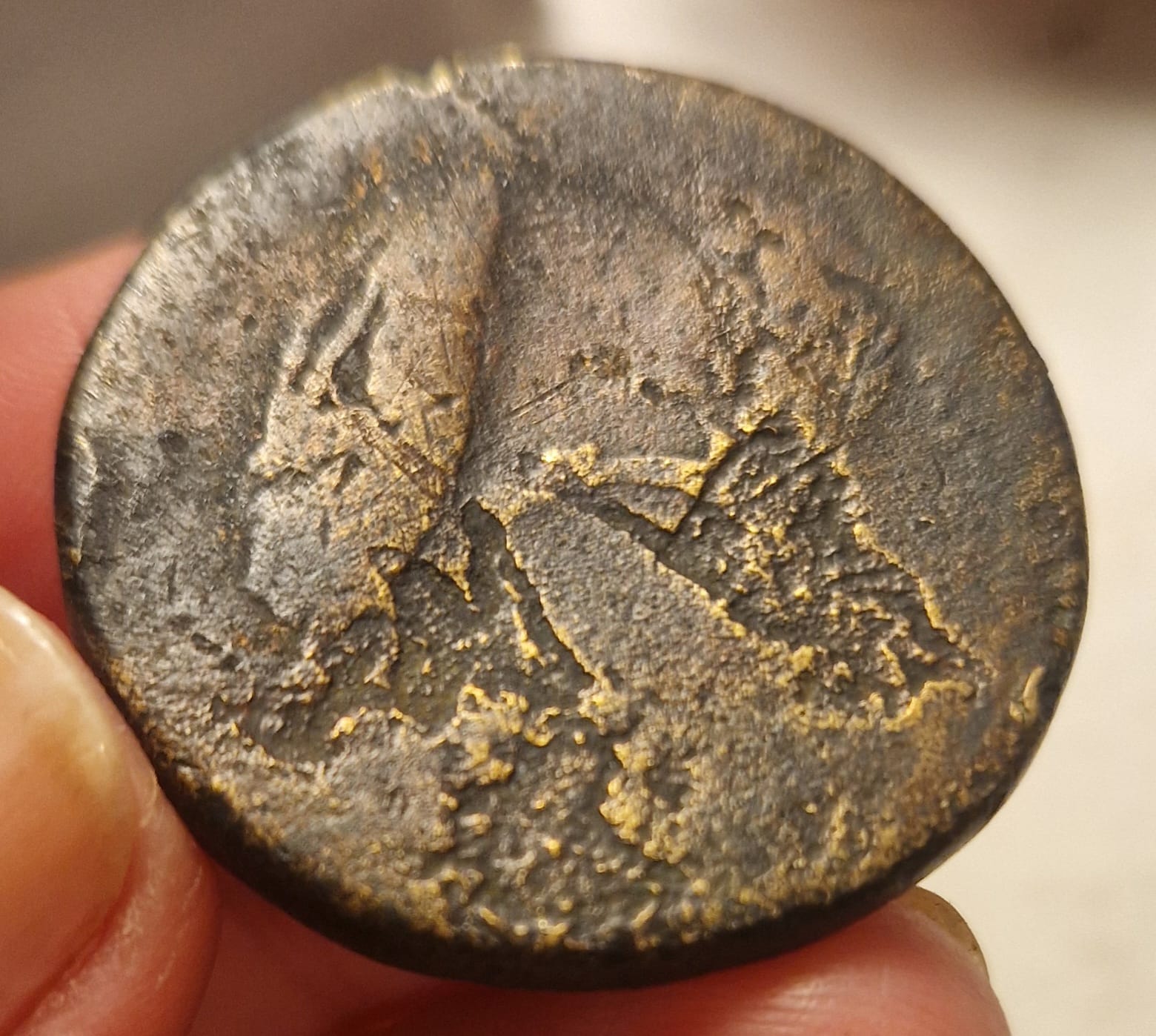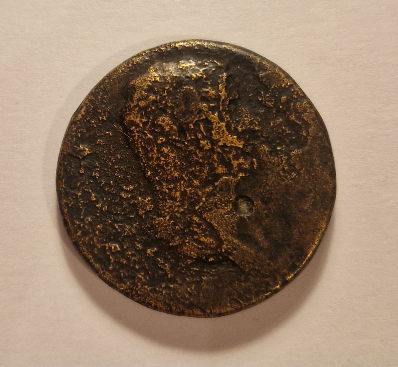 Az én érmém is egy ilyen erősen korrodált darab, és mert ilyen, a pontos korát és azt hogy pontosan melyik császárt ábrázolja, már nemigen lehet megállapítani, ugyanis a numizmatikában a biztos azonosításhoz általában a pontos portré és-vagy a felirat is szükséges.