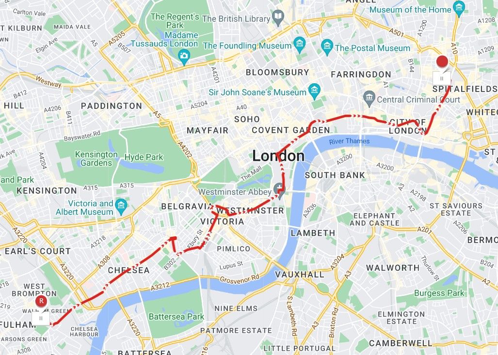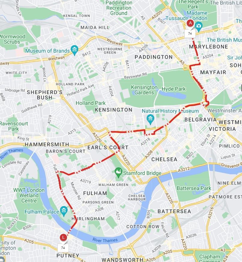 Ezen a vonalon London finomabb környékeit utazhatjuk körbe, elindulva a dél-nyugat londoni Putney városrészből, keresztül Fulham High Street-en, a West Brompton városrészen ahol London egyik legszebb temetőjében érdemes egy kis csendes sétát tenni.