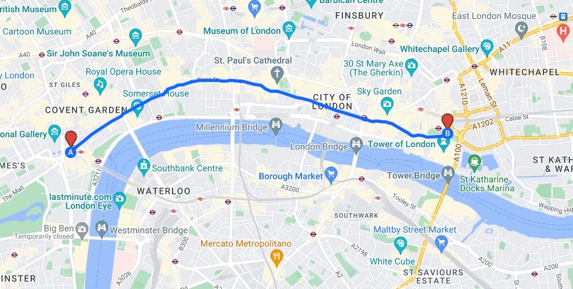 Bekanyarodva a Whitehall nevezetű széles útra (ami egyébként maga a kormányzati negyed), a busz ablakából látni a lovasőrséget majd a Trafalgar Square-re kanyarodva a busz a történelmi Strand nevű széles út mentén halad tovább, elhaladva a Royal Court of Justice épülete előtt majd lekanyarodva a Fleet Street-re ami a londoni City középkori központjának is tekinthető.