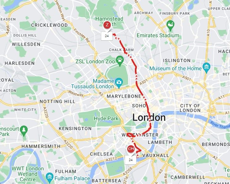 Busz 24 - Pimlico városrész és Hampstead Heath városrész között