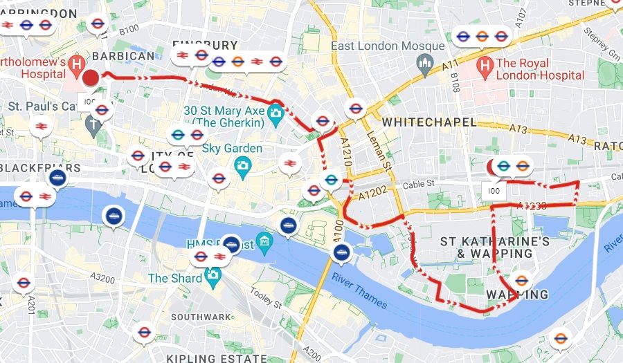 Busz 100 - St. Paul's Cathedral és Shadwell állomás között (kis busz)