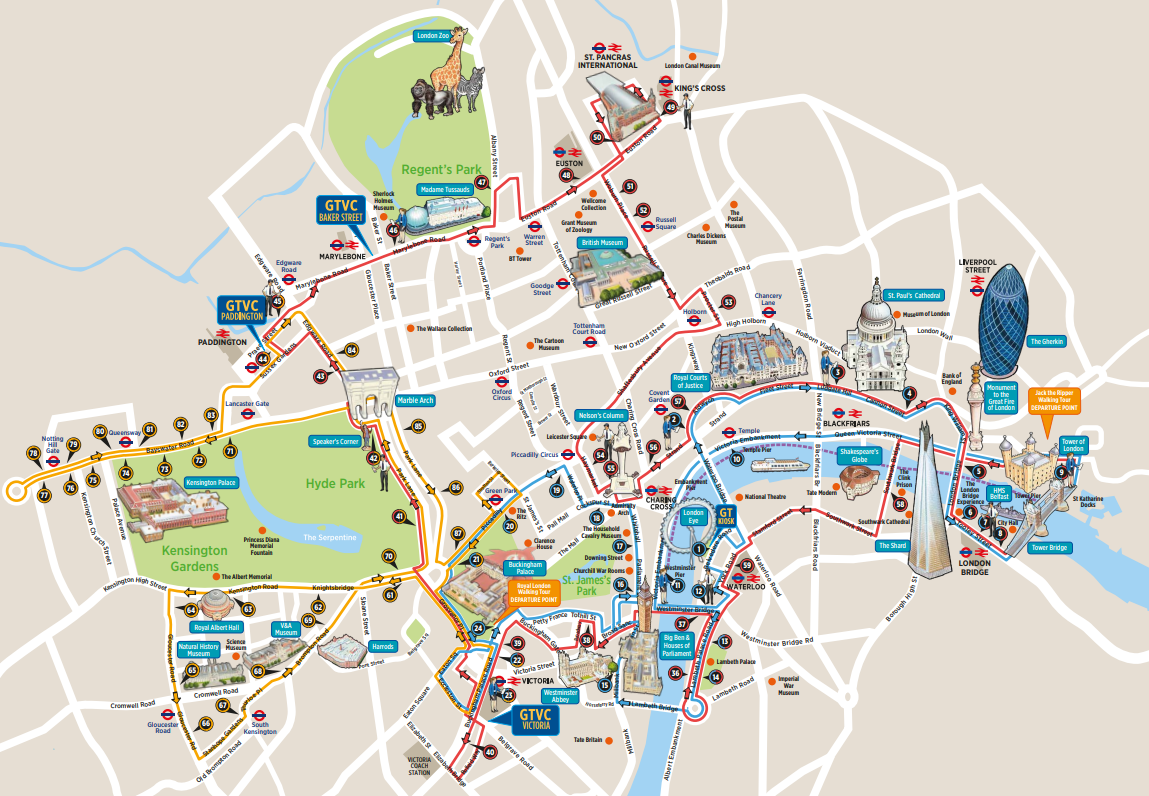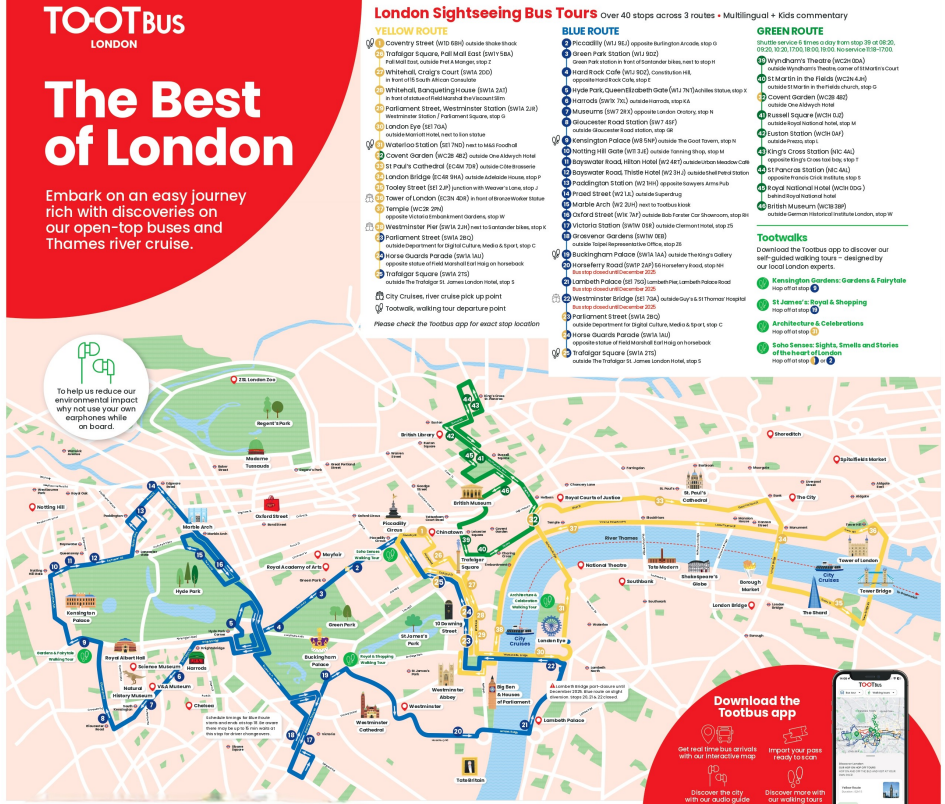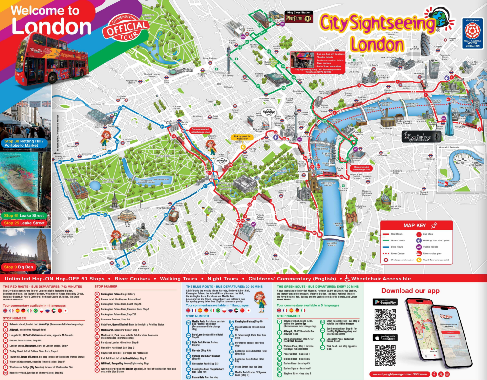Green Park - Hyde Park Corner - Marble Arch (Speaker’s Corner) - Royal Mews/Buckingham House - London Eye - Waterloo Station - Covent Garden - St Paul’s Cathedral - Tower of London/Tower Bridge - Lovasőrség - Trafalgar Square - Baker Street (Madame Tussauds) - Regent's Park